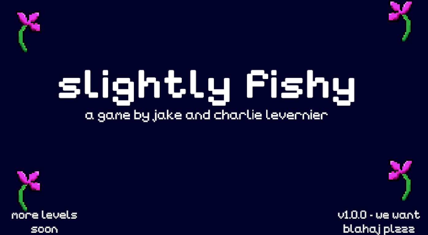 This game is called Slightly Fishy, and in it your are a squid trying to get the fish food at the end of the level before it falls into the shark (blahaj's) mouth. You control your player with wasd or arrows (or even controller joysticks if you really want), and your goal is to get to the end without hitting a moving shark (blahaj) or expanding pufferfish. There are fish powerups along the way, including the orange one (that makes you faster), the blue one (which makes you slower), the green one (which makes you larger), and then red one (which makes you smaller). You start at 2 out of 5 for size and speed, and the counters in the lefthand corner change to represent your current speed and size values. The game is fully pixel art (designed entirely by Charlie), and all of the movement and other logic scripts are based on an underwater environment (created fully by Jake, except for the cinemachine camera movement script).